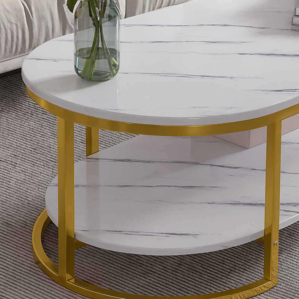 Oval Lux je spoj modernog dizajna i funkcionalne elegancije. Njegova kombinacija mermernog dekora i zlatnih linija čini ga istaknutim elementom svakog dnevnog boravka, kancelarije ili hotelskog lobija.